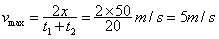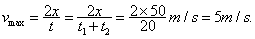 5、计算题 从车站开出的汽车,做匀加速直线运动,走了12 s时,刚好达到最大速度,发现还有乘客没上来,于是立即做匀减速运动至停车,总共历时20 s,行进了50 m,求汽车的最大速度.