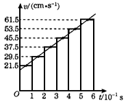 得,0.05 s、0.15 s、0.25 s、0.35 s、0.45s、0.55s时对应的速度分别为22.5 cm/s、30.5 cm/s、37.5 cm/s、45.5 cm/s、53.5 cm/s、61.5 cm/s,其v-t图象如图所示
