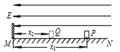 3、计算题 如图所示,水平光滑绝缘轨道MN的左端有一固定绝缘挡板,轨道所在空间存在水平向左、E=4×102N/C的匀强电场。一个质量m=0.2kg、带电荷量q=5.0×10-5C的滑块(可视为质点),从轨道上与挡板相距x1=0.2m的P点由静止释放,滑块在电场力作用下向左做匀加速直线运动。当滑块与挡板碰撞后滑块沿轨道向右做匀减速直线运动,运动到与挡板相距x2=0.1m的Q点,滑块第一次速度减为零。若滑块在运动过程中,电荷量始终保持不变,求: