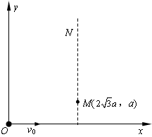 4、计算题 如图,xoy平面内存在着沿y轴正方向的匀强电场,一个质量为m、带电荷量为+q的粒子从坐标原点O以速度v0沿x轴正方向开始运动。当它经过图中虚线上的M(