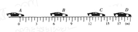 2、计算题  (10分)如图所示为某辆汽车制动过程的频闪照片,汽车匀速运动到A位置时照相机开始拍照,以后汽车沿直线向右运动的过程中,照相机每隔0.5 s拍照一次,且汽车到达B位置时开始制动.仔细观察频闪照片,求: