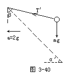 可见,当滑块以a=2g加速向左运动时,小球已脱离斜面飘起.此时小球仅受两个力作用:重力mg、线中拉力T′(图3-40).设线与竖直方向间夹角为β.同理由牛顿第二定律得