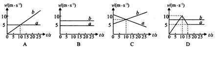 本题解析:在v—t图象中,图象与时间轴围成的面积等于物体的位移,A图对应的比赛中,10S时两车距离最远,A错误;B图对应的比赛中,b车和a车之间的距离越来越大,B错误;C图对应的比赛中,20s时b车追上a车,然后两车不可能再次相遇,C错误;D图对应的比赛中,a车距离b车最近的时刻是在17.5s,但此时a车仍没追上b车,以后a车距离b车越来越远,再也不可能追上b车了,D正确