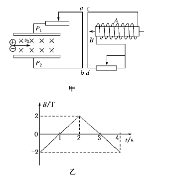 4、选择题 等离子气流由左方连续以v0射入P1和P2两板间的匀强磁场中,ab直导线与P1、P2相连接,线圈A与直导线cd连接.线圈A内有随图乙所示的变化磁场.且磁场B的正方向规定为向左,如图甲所示,则下列叙述正确的是(? )