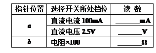 | 开关(S2)、电线若干 | ? 3、实验题 用多用电表进行了几次测量,指针分别处于a、b的位置,如图所示。若多用电表的选择开关处于下面表格中所指的档位,a和b的相应读数是多少?请填在表格中。