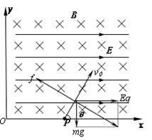 本题解析:(1)如图粒子在复合场中做匀速直线运动,设速度v0与x轴夹角为θ,依题意得:粒子合力为零。①(1分)