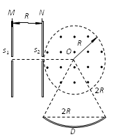 2、计算题 如图,相距为R的两块平行金属板M、N正对放置,s1、s2分别为M、N板上的小孔,s1、s2、O三点共线且水平,且s2O=R。以O为圆心、R为半径的圆形区域内存在大小为B、方向垂直纸面向外的匀强磁场。收集板D上各点到O点的距离以及板两端点的距离都为2R,板两端点的连线垂直M、N板。质量为m、带电量为+q的粒子,经s1无初速进入M、N间的电场后,通过s2进入磁场。粒子重力不计。