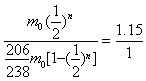 4、计算题 测得某矿石中铀、铅比例为1.15:1,若开始时此矿石中只含有铀238,发生衰变的铀238都变成了铅206,且铀衰变成铅的半衰期是4.5×109年,求此矿石的年龄。