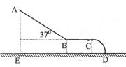 3、计算题 如图所示为某小区儿童娱乐的滑滑梯示意图,其中AB为斜面滑槽,与水平方向夹角为37o,BC为水平滑槽,与半径为0.2m的1/4圆弧CD相切,ED为地面.已知儿童在滑槽上滑动时的动摩擦系数都是0.5,A点离地面的竖直高度AE为2m,试求: