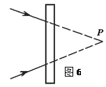 5、选择题 如图所示,在两束光的交点P前,放一块长方形的玻璃砖则交点位置: