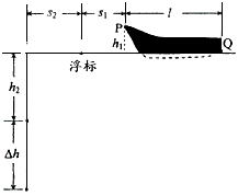1、计算题 一赛艇停在平静的水面上,赛艇前端有一标记P离水面的高度为h1=0.6m,尾部下端Q略高于水面;赛艇正前方离赛艇前端S1=0.8m处有一浮标,示意如图。一潜水员在浮标前方S2=3.0m处下潜到深度为h2=4.0m时,看到标记刚好被浮标挡住,此处看不到船尾端Q;继续下潜△h=4.0m,恰好能看见Q。求
