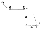 ,末端B点与水平传送带相切,物块由B点滑上粗糙的传送带。若传送带静止,物块滑到传送带的末端C点后做平抛运动,落到水平地面上的D点,已知C点到地面的高度H=5m,C点到D点的水平距离为,g=10m/s2。求: