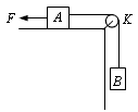 3、计算题 如图所示,在水平桌面的边角处有一轻质光的定滑轮K,一条不可伸长的轻绳绕过K分别与物块A、B相连,A、B的质量分别为mA、mB。开始时系统处于静止状态。现用一水平恒力F拉物块A,使物块B上升。已知当B上升距离为h时,B的速度为v。求此过程中物块A克服摩擦力所做的功。重力加速度为g。