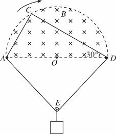 1、选择题 如图所示,竖直面内有一个闭合导线框ACDE(由细软导线制成)挂在两固定点A.D上,水平线段AD为半圆的直径,在导线框的E处有一个动滑轮,动滑轮下面挂一重物,使导线处于绷紧状态。在半圆形区域内,有磁感应强度大小为B.方向垂直纸面向里的有界匀强磁场。设导线框的电阻为r,圆的半径为R,在将导线上的C点以恒定角速度ω(相对圆心O)从A点沿圆弧移动的过程中,若不考虑导线中电流间的相互作用,则下列说法正确的是( )