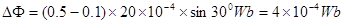 2、填空题 一个200匝、面积为20 cm2的线圈,放在磁场中,磁场的方向与线圈平面成30°角,若磁感应强度在0.05 s内由0.1 T增加到0.5 T.在此过程中穿过线圈的磁通量的变化是_________ Wb;磁通量的平均变化率是___________ Wb/s;线圈中的感应电动势的大小是___________ V.
