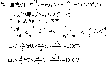 =1000V时,带电粒子恰好沿直线穿过板间,问粒子所带电荷的符号及量值,并计算AB间电压在什么范围内带电粒子能从板间飞出(g取10m/
