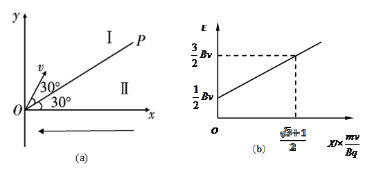 1、计算题 如图(a)所示,在空间有一坐标系xoy,直线OP与x轴正方向的夹角为30°,第一象限内有两个方向都垂直纸面向外的匀强磁场区域Ⅰ和Ⅱ,直线OP是它们的边界,OP上方区域Ⅰ中磁场的磁感应强度为B,一质量为m,电荷量为+q的质子(不计重力及质子对磁场的影响)以速度v从O点沿与OP成30°角的方向垂直磁场进入区域Ⅰ,质子先后通过磁场区域Ⅰ和Ⅱ后,恰好垂直于x轴进入第四象限,第四象限存在沿-x轴方向的特殊电场,电场强度E的大小与横坐标x的关系如图(b)所示,试求: