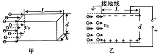 5、计算题 如图甲所示,静电除尘装置中有一长为L、宽为b、高为d的矩形通道,其前、后面板使用绝缘材料,上、下面板使用金属材料。图乙是装置的截面图,上、下两板与电压恒定的高压直流电源相连。质量为m、电荷量为-q、分布均匀的尘埃以水平速度v0进入矩形通道,当带负电的尘埃碰到下板后其所带电荷被中和,同时被收集。通过调整两板间距d可以改变收集效率η。当d=d0时,η为81%(即离下板0.81d0范围内的尘埃能够被收集)。不计尘埃的重力及尘埃之间的相互作用。