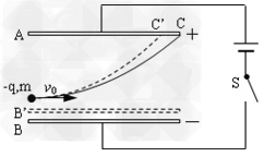 4、选择题 如图所示,闭合开关S后A、B板间产生恒定电压U0,已知两极板的长度均为L,带负电的粒子(重力不计)以恒定的初速度V0,从上板左端点正下方h处,平行极板射入电场,恰好打在上板的右端C点。若将下板向上移动距离为板间距的