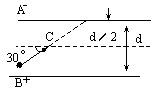 3、计算题 1000eV的电子流在两极板中央斜向上方进入匀强电场,电场方向竖直向上,它的初速度与水平方向夹角为30°,如图。为了使电子不打到上面的金属板上,应该在两金属板上加多大电压U?