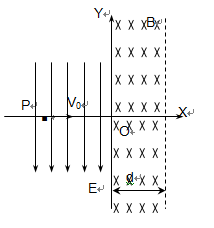 3、计算题 如图所示,直角坐标系xoy位于竖直平面内,在-m≤x≤0的区域内有磁感应强度大小B=4.0×10-4T、方向垂直于纸面向里的条形匀强磁场,其左边界与x轴交于P点;在x>0的区域内有电场强度大小E=4N/C、方向沿y轴正方向的条形匀强电场,其宽度d=2m。一质量m=6.4×10-27kg、电荷量q=-3.2×10-19C的带电粒子从P点以速度v=4×104m/s,沿与x轴正方向成α=60°角射入磁场,经电场偏转最终通过x轴上的Q点(图中未标出),不计粒子重力。求: