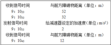 4、简答题 人类为了探测距离地球大约3.0×105km的月球,发射了一种类似四轮小车的月球探测器.它能够在自动导航系统的控制下行走,且每隔10s向地球发射一次信号.探测器上还装着两个相同的减速器(其中一个是备用的),这种减速器可提供的最大加速度为5m/s2.某次探测器的自动导航系统出现故障,从而使探测器只能匀速前进而不再能自动避开障碍物.此时地球上的科学家必须对探测器进行人工遥控操作.下表为控制中心的显示屏的数据(时刻的读法:9:1020为九时十分二十秒):