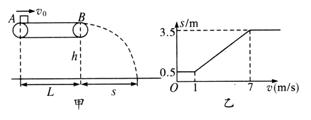 3、计算题 如图甲所示,水平传送带的长度L="6" m,皮带轮以速度v顺时针匀速转动,现在一质量为1 kg的小物体(可视为质点)以水平速度v0从A点滑上传送带,越过B点后做平抛运动,其水平位移为s,保持物块的初速度v0不变,多次改变皮带轮的速度v依次测量水平位移s,得到如图乙所示的s-v图象.