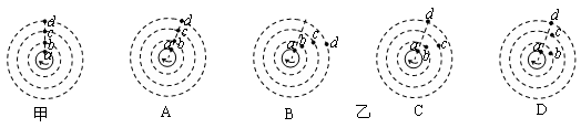 2、选择题 如图甲所示,a是地球赤道上的一点,某时刻在a的正上方有b、c、d三颗运行轨道位于赤道平面的卫星,各卫星的运行方向均与地球自转方向(顺时针转动)相同,其中d是地球同步卫星。从此时刻起,经过时间t(已知时间t均小于三颗卫星的运行周期),在乙图中各卫星相对a的位置最接近实际的是( ?)