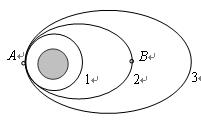 2、选择题 “嫦娥一号”探月卫星绕地运行一段时间后,离开地球飞向月球。如图所示是绕地飞行的三条轨道,轨道1是近地圆形轨道,2和3是变轨后的椭圆轨道。A点是2轨道的近地点,B点是2轨道的远地点,卫星在轨道1的运行速率为 7.7km/s,则下列说法中正确的是