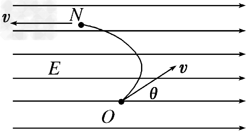 5、计算题 如图所示,一个带电荷量为-q的油滴,从O点以速度v射入匀强电场中,v的方向与电场方向成θ角。已知油滴的质量为m,测得油滴到达运动轨迹的最高点N时,它的速度大小仍为v。求: