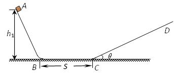 1、计算题 如图所示,某滑道由AB、BC、CD三段轨道组成,轨道交接处均由很小的圆弧平滑连接(不考虑能量损失),其中轨道AB段是光滑的,水平轨道BC的长度,轨道CD足够长且倾角