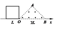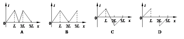 1、选择题 如图所示,等腰直角三角形AOB内部存在着垂直纸面向外的匀强磁场,OB在x轴上,长度为2L。纸面内一边长为L的正方形导线框的一边在x轴上,沿x轴正方向以恒定的速度穿过磁场区域。规定顺时针方向为导线框中感应电流的正方向,t=0时刻导线框正好处于图示位置。则下面四幅图中能正确表示导线框中感应电流i随位移x变化的是