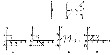 2、选择题  在光滑水平桌面上有一边长为I的正方形线框abcd,bc边右侧有一等腰直角三角形匀强磁场区域efg,三角形腰长为I,磁感应强度垂直桌面向下,abef可在同一直线上,其俯视图如图所示,线框从图示位置在水平拉力F作用下向右匀速穿过磁场区,线框中感应电流I及拉力F随时间t的变化关系可能是(以逆时针方向为电流的正方向,时间单位为I/V)