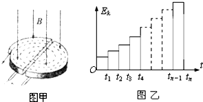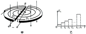 4、选择题 图甲是回旋加速器的原理示意图。其核心部分是两个D型金属盒,在加速带电粒子时,两金属盒置于匀强磁场中(磁感应强度大小恒定),并分别与高频电源相连。加速时某带电粒子的动能EK随时间t变化规律如图乙所示,若忽略带电粒子在电场中的加速时间,则下列判断正确的是( )