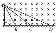 5、选择题 斜面顶端在同一高度的三个光滑斜面AB、AC、AD,均处于水平方向的匀强磁场中.一个带负电的绝缘物块,分别从三个斜面顶端A点由静止释放,设滑到底端的时间分别为t1、t2、t3,则( )