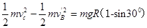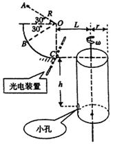 光滑圆弧轨道竖直固定,过最低点的半径OC处于竖直位置,其右方有底面半径r=0.2m的转筒,转筒顶端与C等高,下部有一小孔,距顶端h=1m,转筒的轴线与圆弧轨道在同一竖直平面内,开始时小孔也在这一平面内的图示位置.现使一质量m=0.1kg的小物块自A点由静止开始下落后打在圆弧轨道上的B点但不反弹,在瞬间碰撞过程中,小物块沿半径方向的分速度立刻减为0,沿切线方向的分速度不变.此后,小物块沿圆弧轨道滑下,到达C点时触动光电装置,使转筒立刻以某一角速度匀速转动起来,且小物块最终正好进入小孔.已知A、B到圆心O的距离均为R,与水平方向的夹角均为θ=30°,不计空气阻力,g取l0m/s2,求: