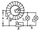 1、选择题 如图是一种理想自耦变压器示意图。线圈绕在一个圆环形的铁芯上,P是可移动的滑动触头。AB间接交流电压u,输出端接了两个相同的灯泡L1和L2,Q为滑动变阻器的滑动触头。当开关S闭合,P处于如图所示的位置时,两灯均能发光。下列说法正确的是