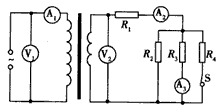 5、选择题 如图,一理想变压器原线圈接入一交流电源,副线圈电路中R1、R2、R3和R4均为固定电阻,开关S是闭合的,V1和V2为理想电压表,读数分别为U1和U2;A1、A2和A3为理想电流表,读数分别为I1、I2和I3,现断开S,U1数值不变,下列推断中正确的是