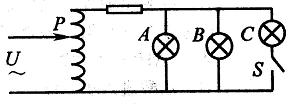 2、选择题 如图所示,自耦变压器的输出端有ABC三个完全相同的小灯泡,且认为小灯泡的电阻不受温度的影响,将正弦交流电接入自耦变压器的输入端。开始时自耦变压器的滑片P处于某一位置,电键S闭合,三个小灯泡均发光。;操作过程中,小灯泡两端电压均未超过其额定值。下列说法中正确的是