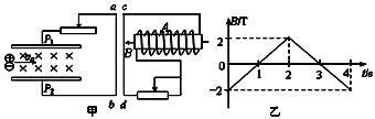 3、选择题 等离子气流由左方连续以v0射入Pl和P2两板间的匀强磁场中,ab直导线与Pl、P2相连接,线圈A与直导线cd连接。线圈A内有随图乙所示的变化磁场。且磁场B的正方向规定为向左,如图甲所示,则下列说法正确的是