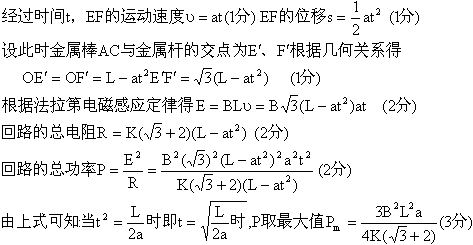 1、简答题 如图所示,在磁感应强度为B的匀强磁场中,两根金属杆OM、ON在O点相接,夹角为120°。金属棒AC与两金属杆接触,接触点是E、F,△OEF是等腰三角形,EO=L。金属杆、金属棒单位长度的电阻都是K,现让AC以加速度a从静止开始垂直于AC向左运动,求回路中电功率的最大值。(已知磁场方向垂直△OEF所在平面)。