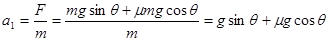 本题解析:小滑块刚放上传送带时,传送带相对于滑块向下运动,小滑块收到重力、支持力和沿斜面向下的摩擦力,把重力进行正交分解,沿斜面向下的加速度,物体以加速度a1向下加速运动。当小滑块与传送带具有共同速度时,重力沿斜面向下分量为