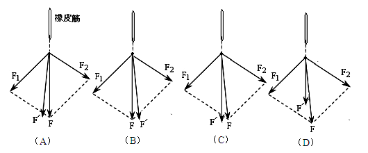 4、选择题 在“研究两个共点力的合成” 的实验中,有同学各自画了以下的力图,图中F1、F2是用两把弹簧秤同时拉橡皮筋时各自的拉力, F/是用一把弹簧秤拉橡皮筋时的拉力;画出了F1、F2、F/的图示,以表示F1、F2的有向线段为邻边画平行四边形, 以F1、F2交点为起点的对角线用F表示,在以下四幅图中,只有一幅图是合理的,这幅图是(?)