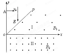 2、计算题 (16分)如图所示,直线OP与x轴的夹角为45o,OP上方有沿y轴负方向的匀强电场,OP与x轴之间的有垂直纸面向外的匀强磁场区域I,x轴下方有垂直纸面向外的匀强磁场区域II。不计重力,一质量为m、带电量为q的粒子从y轴上的A(0,l)点以速度