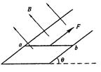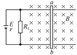 5、实验题  如图所示,质量不计的直金属棒ab,被置于平行、光滑的金属轨道上,匀强磁场的磁感应强度B="0.2" T,方向如图2-5-13所示,ab长10 cm当对ab施加一个大小为0.04 N,方向水平向左的外力时,棒ab恰好不动,已知电源内阻r="1" Ω,R1="8" Ω,Rab="4" Ω,求:电源电动势的大小E=____________。