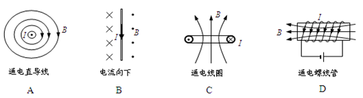 2、选择题  下列各图画出了通电导体产生的磁场方向,正确的是