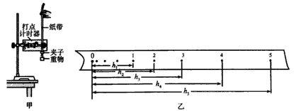 4、实验题 验证机械能守恒定律的实验装置如图甲所示。某同学利用纸带进行研究:从点迹较密处选一个清晰点作为起始点0,然后依次取测量点1,2,3,4,5,再测量出各测量点到0点的距离h1,h2,h3,h4,h5,如图乙所示。