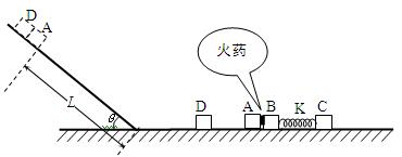 1、计算题 如图所示 ,粗糙斜面与光滑水平面通过半径可忽略的光滑小圆弧平滑连接,斜面倾角 θ = 37°,A、C、D滑块的质量为 mA= mC= mD=" m" =" 1" kg,B滑块的质量 mB =" 4" m =" 4" kg(各滑块均视为质点)。A、B间夹着质量可忽略的火药。K为处于原长的轻质弹簧,两端分别连接住B和C。现点燃火药(此时间极短且不会影响各物体的质量和各表面的光滑程度),此后,发现A与D相碰后粘在一起,接着沿斜面前进了L =" 0.8" m 时速度减为零,此后设法让它们不再滑下。已知滑块A、D与斜面间的动摩擦因数均为 μ = 0.5,取 g = 10 m/s2,sin37°= 0.6,cos37°= 0.8。求: