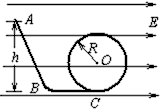 5、计算题  如图所示的装置是在竖直平面内放置光滑的绝缘轨道,处于水平向右的匀强电场中,以带负电荷的小球从高h的A处静止开始下滑,沿轨道ABC运动后进入圆环内作圆周运动。已知小球所受到电场力是其重力的3/4,圆滑半径为R,斜面倾角为θ=53°,sBC=2R。若使小球在圆环内能作完整的圆周运动,h至少为多少?(sin37°=0.6 sin53°=0.8)