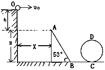 1、计算题  如图所示,将一质量m=0.1kg的小球自水平平台顶端O点水平抛出,小球恰好与斜面无碰撞的落到平台右侧一倾角为=53°的光滑斜面顶端A并沿斜面下滑,然后以不变的速率过B点后进入光滑水平轨道BC部分,再进入光滑的竖直圆轨道内侧运动。已知斜面顶端与平台的高度差h=3.2m,斜面顶端高H=15m,竖直圆轨道半径R=5m。(重力加速度g=10m/s2,sin53°=0.8,cos53°=0.6)求: